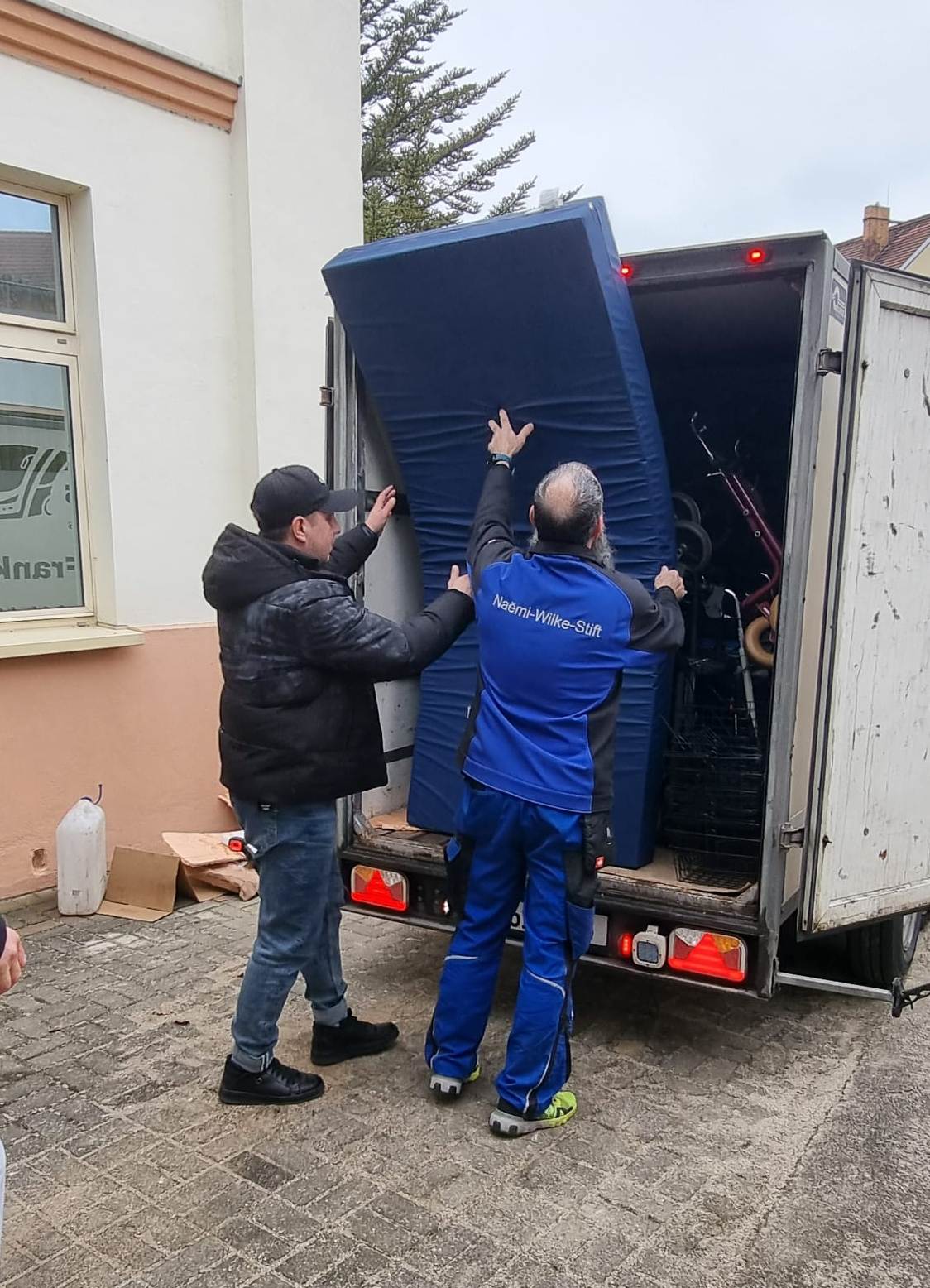Benjamin Gumprich (l.) und Thomas Bäro aus der technischen Abteilung des Naëmi-Wilke-Stifts laden die Pakete in den Transporter.                 F.: Naëmi-Wilke-Stift/Renate Kulick-Aldag